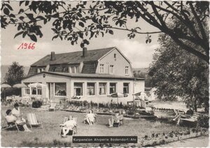 Karte im Querformat mit gewelltem Rand und SW-Druck. Die Bildseite zeigt Kurgäste in Liegestühle auf der Liegewiese vor der Kurpension Ahrperle. Unten dem Bild in einem schwarzen Textband steht in weißer Schrift "Kurpension Ahrperle Bodendorf/Ahr". Rückseite: Oben links: "Hotel - Kurpension "Ahrperle" / Bes. Eheleute Barrenstein / Bad Bodendorf/Ahr / Telefon xxx Amt Remagen". Senkrecht mittig: "s- Jakob und Helene Steinborn, Lichtbildner - Bad Neuenahr / Kurkolonnade 5, Ruf xxx". Die Karte wurde von einem Kurgast beschriftet und nach Düsseldorf Büderich verschickt worden. Frankiert ist die Karte mit einer 20 Pfg.-Briefmarke Deutsche Post.