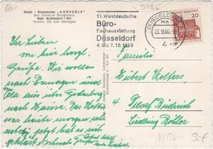Karte im Querformat mit gewelltem Rand und SW-Druck. Die Bildseite zeigt Kurgäste in Liegestühle auf der Liegewiese vor der Kurpension Ahrperle. Unten dem Bild in einem schwarzen Textband steht in weißer Schrift "Kurpension Ahrperle Bodendorf/Ahr". Rückseite: Oben links: "Hotel - Kurpension "Ahrperle" / Bes. Eheleute Barrenstein / Bad Bodendorf/Ahr / Telefon xxx Amt Remagen". Senkrecht mittig: "s- Jakob und Helene Steinborn, Lichtbildner - Bad Neuenahr / Kurkolonnade 5, Ruf xxx". Die Karte wurde von einem Kurgast beschriftet und nach Düsseldorf Büderich verschickt worden. Frankiert ist die Karte mit einer 20 Pfg.-Briefmarke Deutsche Post.