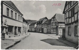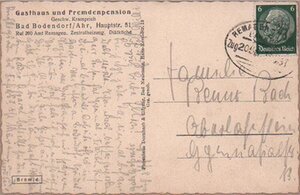 Karte im Querformat, Rand ist gezackt und SW-Druck, Bild in weißem Rahmen eingefasst. Vorderseite: Das Bild zeigt als Hauptelement das Dorfpanorame mit den Weinlagen am Reisberg. Ein kleineres Bild, oben rechts, zeigt das Gasthaus und Fremdenpension Kramprich. Text unten links unter Bild "Bodendorf/Ahr" Die Rückseite ist von einem Gast beschrieben und an einen Empfänger in verschickt worden. Oben links: "Gasthaus und Fremdenpension Geschw. Kramprich Bodendorf/Ahr Hauptstraße 51 Ruf Amt Remagen. Zentralheizung, Diätküche". Unten Links "Bromid" Unten links: "Echte Fotografie" Senkrecht "Photohaus Dornbach & Elfgang, Bad Neuenahr, Hans-Kerrl-Str. 10 Ges. gesch." Frankiert ist die Karte mit einer 6 Pfg.-Briefmarke Motiv Hindenburg