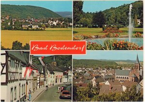 Karte im Querformat und im Buntdruck. Vorderseite: Das Bild zeigt in vier Feldern den Ort Bad Bodendorf. Oben links Blick aus Ahrtel zum Reisberg mit Ort im Mittelfeld; rechts Springbrunnen im Kurpark mit Thermalbad im Hintergrund; links unten Blick in die unteres Hauptstraße mit Fahnenschmuck an den Häusern; unten rechts Blick vom Reisberg mit Kirche am rechten Bildrand. Vorderseite: Text mittig in rotem Feld "Bad Bodendorf" Rückseite: Oben links "Bad Bodendorf Heilbad". Senkrecht "40 Jahre Robert Cornely Verlag, 9839 Bad Wörishofen. Jeglicher Nachdruck verboten" Im Briefmarkenfeld "EINE Cornely-KARTE Nr. 9729"
