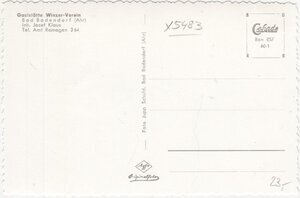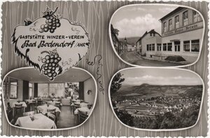 Karte mit gewelltem Rand und schwarz-weiß Druck. Auf der Vorderseite drei Bildausschnitte in runden Fenstern und Werbelogo in Traubenform der Winzergaststätte. Hintergrund langgestreiftes senkrechtes Muster. Bild oben rechts im rechten Bildrand Blick in die Hauptstraße mit Gaststätte Winzerverein. Unten Links Blick in die Gaststube und rechts unten Blick vom Reisberg übers Dorf mit Hintergrund Landskron. Auf der Rückseite oben links "Gaststätte Winzer-Verein / Bad Bodendorf (Ahr) / Inh. Josef Klaus / Tel. Amt Remagen 364"; mittig senkreckt "Agfa Originalfotos Jupp Schuld, Bad Bodendorf (Ahr). Im Briefmarkenfeld "Cerkade / Bon 057 / 60/1"