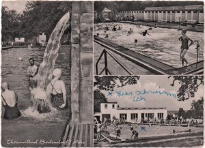Karte im Querformat und SW-Druck mit gewelltem Rand. Vorderseite: Links Wasserfall am Beckenrand. Rechts oben Blick über Becken mit Schwimmer und im Hintergrund Badekabinen. Unten rechts Blick über Schwimmbecken zum Eingangsbereich mit Gastronomie. Kreuz im Becken mit blauem Stift und darüber handschriftlich "Hier schwimme ich". Vorderseite: Unten links "Thermalbad Bodendorf/Ahr Rückseite: Senkrecht: "Foto und Verlag W. Strang. Remagen/Rh. Tel. 605" Die Karte wurde von einem Kurgast beschriftet und nach Wuppertal-Elberfeld geschickt. Frankiert ist die Karte mit einer 10 Pfg Europabriefmarke. Auf dem Poststempel steht umlaufend Bodendorf/Ahr und Kurbad mit Warmquellen.