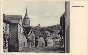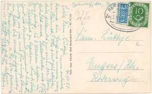 Karte im Querformat und im SW-Druck mit einem unterschiedlich breiten weißen Rahmen. Die Straße ist mit Kopfsteinpflaster versehen. Ganz rechts Gasthaus und Fremdenpension Geschwister Kramprich. Vorn links Hausausschnitt vom Café Clever und daneben die Metzgerei. Am Ende der Straße das Pfarrhaus und davor das Gästehaus Wie daheim. Die Karte ist Rückseitig beschrieben und nach Engers verschickt worden. Frankiert ist die Karte mit einer 10 Pfennig Marke Deutsche Bundespost und einer 2 Pfennig Notopfer Berlin Steuermarke.