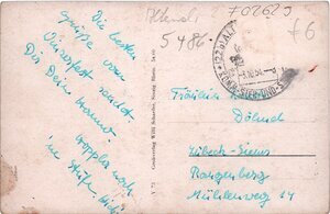 Karte im Querformat, im SW-Druck. Die Grundfarbe der Karte weiß und in der Mitte ein kleineres Bild mit schief stehenden und verzogenen Häuser. Die Karte ist von einem Gast, wohl in Weinlaune, beschrieben und nach Lübeck-Siems verschickt worden. Die Briefmarke auf der Rückseite ist abgelöst. Vorderseite mittig unten im Bild "Grad aus dem Winzerhaus komm ich heraus". Unter Bild im freien Feld ein Gedicht: Wer an der Ahr war und weiß, das er da war, der war nicht an der Ahr. Wer aber an der Ahr war und weiß nicht daß er da war, der war an der Ahr. Rückseite: Neben Briefmarkenfeld handschriftlich "Altenahr 5486 F02620"; Text der Karte "Die bersten Grüße vom Winzerfest sendet Dir Dein Helmut. Hoppea noch ´ne Stufe. Hick!", Empfänger der karte "Fräulein ????? Döhnel Lübeck-Siems Romgenberg Mühlenweg 14" Mittig senkrecht "Y 73 Großverlag Willi Schäfer, Sinzig Rhein 54/60"