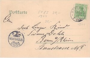 Karte im Querformat und im Bunt-Druck. Die Vorderseite zeigt in drei Illustrationen den Weinort Bodendorf. Oben links oben Blick vom Sonnenberg über den Weinberg im Vordergrund über den Ort ins Rheintal. Bild rechts oben zeigt die Burg Bodendorf hinter einem Zaun mit Tannenbäumen davor. Darunter, in einem als Stempel gezeichneten Doppelkreis, den Winzerverein. Zwischen den Bildern eine Rebenranke und eine Säule mit Polygonen Dekor. Die Karte wurde auf der Bildseite von einem Kurgast beschriftet und nach Bonn verschickt. Frankiert ist die Karte mit einer 5 Pfg. Briefmarke Deutsches Reich mit Motiv Jugendstielportrait. Vorderseite: Oben links eingedruckt "Postkarte". Das Adressfeld ist in Handschrift beschriftet. Auf der Rückseite (Bildseite) ist ein handschriftlicher Gruß geschrieben.