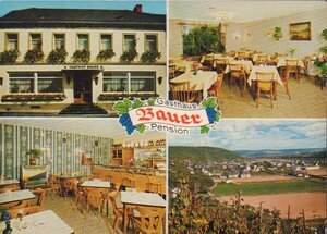 Karte im Querformat und im Bunt-Druck. Vorderseite: Das Bild zeigt in drei kleinen Bildern die Außenansicht des Gasthof-Pension Bauer und die Gasträume im Lokal. Das vierte Bild ist ein Panoramaaufnahme von Bodendorf. Der Name des Gasthauses Bauer ist in einem geschwungenen Band und mit Reben verziert abgedruckt. Vorderseite: Mitten auf der Karte "Gasthaus Bauer Pension" Rückseite: Oben links "Gasthaus Bauer Pension - Bes.: Albert und Christine Giesen - 5481 Bad Bodendorf - Hauptstraße 4 - Tel.: 02642/689 - Fremdenzimmer - Gesellschaftsräume - Parkplatz fließ. w. und kalt Wasser - Brause - Heizung". Senkrecht "35 Jahre Robert Cornely Verlag, 9837 Bad Wörishofen. Nachdruck verboten" Im Briefmarkenfeld "EINE Cornely-KARTE Nr. 12319"