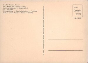 Karte im Querformat und im Bunt-Druck. Vorderseite: Das Bild zeigt in drei kleinen Bildern die Außenansicht des Gasthof-Pension Bauer und die Gasträume im Lokal. Das vierte Bild ist ein Panoramaaufnahme von Bodendorf. Der Name des Gasthauses Bauer ist in einem geschwungenen Band und mit Reben verziert abgedruckt. Vorderseite: Mitten auf der Karte "Gasthaus Bauer Pension" Rückseite: Oben links "Gasthaus Bauer Pension - Bes.: Albert und Christine Giesen - 5481 Bad Bodendorf - Hauptstraße 4 - Tel.: 02642/689 - Fremdenzimmer - Gesellschaftsräume - Parkplatz fließ. w. und kalt Wasser - Brause - Heizung". Senkrecht "35 Jahre Robert Cornely Verlag, 9837 Bad Wörishofen. Nachdruck verboten" Im Briefmarkenfeld "EINE Cornely-KARTE Nr. 12319"