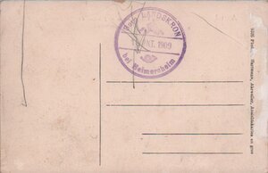 Karte im Querformat, im SW-Druck. Das Bild zeigt die Ansicht von Heimersheim (Bad Neuenahr-Ahrweiler) mit einer Fotomantage der vollständig erhalten Burg Landskron, so wie sie im 17 Jahrhundert ausgesehen haben soll. Vorderseite oben "Ahrtal Die Burg Landskron im 17 Jahrhundert" Rückseite: links Senkrecht: "9326 Photogr. Hartmann, Ahrweiler, Ansichtskarten en gros" Mittig oben ist ein blauer runder Stempel aufgebracht. Im Stempel umlaufend "Burg LANDSKRON bei Heimersheim" und weiter im Kreisinnern oben eine Bischofsmütze und unten ein Posthorn.