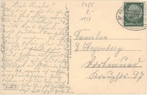 Karte im Querformat und im SW-Druck. Die Vorderseite zeigt die Anlage zwischen Kurhaus und Kurmittelhaus mit gepfegter Parkanlage mit Bänken und Liegestühle. Die Karte wurde von einem Kurgast beschriftet und nach Dortmund verschickt worden. Frankiert ist die Karte mit einer 6 Pfg-Marke Motiv Reichspräsident Hindenburg.