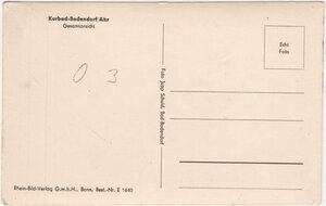 Karte im Querformat und im SW-Druck. Das Titelbild zeigt einen Blick vom Reisberg auf den Ort. Im Hintergrund rechts die Landskron bei Bad Neuenahr. Rückseite: Links oben steht: Kurbad-Bodendorf/Ahr / Gesamtansicht". Links unter steht: "Rhein-Bild-Verlag G.m.b.H., Bonn, Best.-Nr. E 1640". Mittig senkrecht "Foto Jupp Schuld, Kurbad Bodendorf/Ahr". Im Briefmarkenfeld steht "Echt Foto".