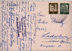 Karte im Querformat, Rand ist gezackt und im SW-Druck Im Einzelstehende sieben Häuser. Im Bildmittelbereich vor Wandrand = Mühlenberg links das Kurhaus, weiter rechts Hotel Haus am Weiher, weiter einzelne Häuser im Kurviertel und Haus Elisabeth. Weiter bis rechter Bildrand weitere Einzelhäuser. Rückseite Mittig Senkrecht: "Foto Jupp Schuld, Bad Bodendorf (Ahr)" Im rechten Kartenfeld mittig Adressenstempel von Dr. Rudolf Träger. Die Karte ist beschriftet und an einen Empfänger in Luchterberg geschickt worden. Frankiert ist die Karte mit einer 10 und einer 5 Pfg. Briefmarke.