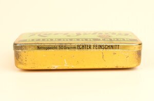 Eine leereTabakdose der Firma Brinkmann, Bremen, aus den 1930er Jahren. Die Dose war ursprünglich mit einem Shag Tabak gefüllt, der primär für kleine Pfeifenköpfe hergestellt wurde. Die Blechdose hat eine goldene Grundfarbe, der Deckel ist mit schwarzen Buchstaben, auf lindgrünem Untergrund mit: "Brinkmann Heri-Schäg - Brinkmann Tabak" bedruckt. Auf der Unterseite ist noch eine Überrest der ehemaligen Steuerbanderole zu sehen.