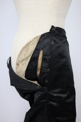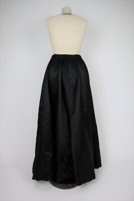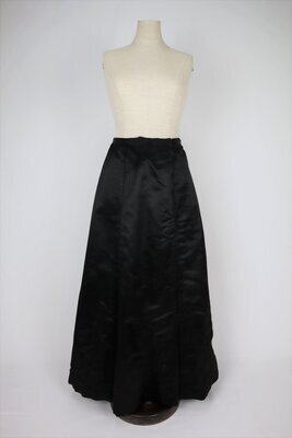 Bahnenrock aus schwarzem Seidensatin, unterfüttert mit steifer Baumwolle. In der vorderen Seitennaht befindet sich ein Verschluss mit eingebauter Tasche. An der Taille schließt der Rock mit Haken und ösen, darunter mit Druckknöpfen. Hinten auf dem Taillenband sind 2 nach oben zeigende Haken jeweils 3,5cm von der hinteren Mitte positioniert. Diese dienen dazu, das Oberteil an der Stelle einzuhaken, sodass dazwischen eine Lücke entstehen kann falls die Kleidung verrutscht. Der Saum bleibt unverarbeitet und ist notdürftig mit einer Zickzacknaht versäubert. Es ist außerdem auffällig, das die Teile der Rückwärtigen Mitte unten aus 2 Stoffstücken zusammengesetzt wurden. Dies ist eine typische Technik der Zeit, da oftmals nicht das ganze Schnitteil auf die Stoffbreite passt oder bei Zuschnitt in einem Teil viel Material verschwenden würde.