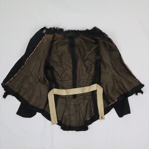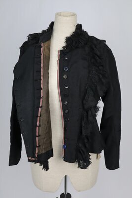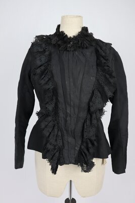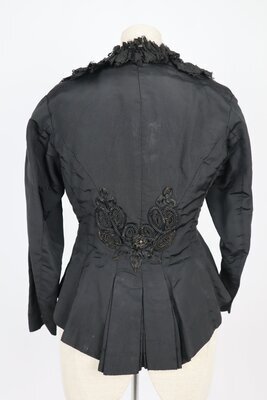 Schwarzes Oberteil aus Seide mit V-förmiger Nadelspitzengarnitur. Das vordere Mittelteil ist in vertikale Falten gelegt und schließt auf der einen Seite mit Haken und Ösen. Das Futter aus mercerisierter brauner Baumwolle schließt in der vorderen Mitte und wird mit einem Taillenband an der Taille auf die Figur gebracht. Hinten entsteht durch das zusammenlaufen der Rückwärtigen Teile ein Schößchen mit doppelten Kellerfalten, die für das nötige Volumen sorgen das Oberteil über einem Rock auffächern zu lassen. Darüber lenkt ein 3-dimensionales Motiv aus Kordeln unterschiedlicher Breite die Blicke auf sich.