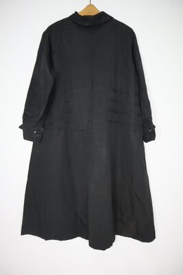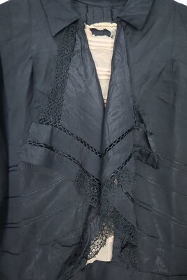 Das Kleid ist größtenteils aus schwarzer Seide mit leichter Streifenstuktur gefertigt. Für Ärmel und vorderes Mittelteil wurden andere Stoffe gewählt. Der hautfarbene Einsatz aus Krepp ist mit waagerechten Biesen verziert und leider schon recht zerrissen. Auf beiden Seiten davon ist ein Volant in der Naht eingesetzt, das locker nach unten fällt und ähnlich wie ein Jabot wirkt. Das Material wird mit Fagottstichen unterbrochen und Nadelspitze ziert die äußeren Kanten. Der Saum ist mit einem 4cm breiten Baumwolleschrägstreifen verstürzt, das Kleid schließt in der rückwärtigen Mitte mit einem Reißverschluss.