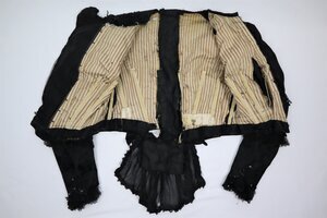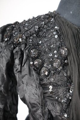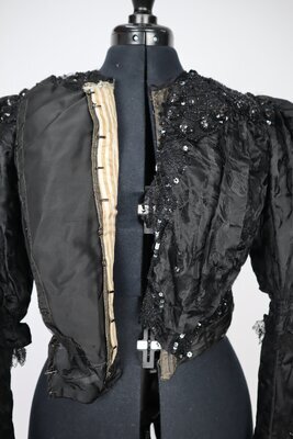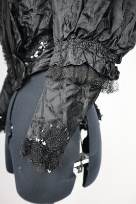 Dieses schwarze Festtagsoberteil ist außergewöhlich elaboriert dekoriert. Es besteht größtenteils aus schwarzem Seidenjacquard, der mit Glasperlen und Gelatine Pailetten bestickt ist. Am Futter ist zu erkennen, dass das Oberteil stark verändert wurde. Die rückwärtige Mitte wurde komplett aufgeschnitten und ein extra Teil aus schwarzer Seide mit Rüschen aus Seidenchiffon eingesetzt. Das Taillenband ist an dieser Stelle durchgeschnitten, es lässt sich von der Aufschrift nur noch ein Teil erkennen: "... odé TRIER". In der vorderen Mitte wurde auch ein Teil hinzugefügt, es besteht aus gefaltetem Seidenchiffon mit machinell bestickter Tüllspitze und ist asymmetrisch. Dadurch wird die wohl originale Pailettendeko um dem Halssausschnitt un die (ursprüngliche vordere Mitte) auf einer Seite verdeckt. Der neue Verschluss ist nicht ganz durchdacht und grade am Hals nicht fertiggestellt. Das Futter ist aus gestreiftem Baumwollestoff, der Verschluss ist ind er vorderen Mitte. Metallstäbe sind auf allen Nähten angebracht und von gestreiftem Stoff umhüllt. Unter den Achseln befinden sich Achselschilde aus einer Art Maschenware, die das Oberteil vor Schweiß schützen.