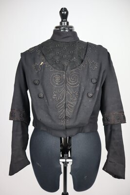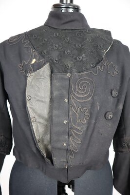 In Falten gelegtes Oberteil aus schwarzer Wolle. Der Ausschnitt und die vordere Mitte sind mit Soutache dekoriert, an den Seiten vorne sind außerdem dekorative, mit GArn bezognene, Knöpfe angebracht. Die Seitennähte und Rückennaht sind am Futter mit Metallstäben verstärkt.