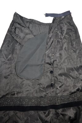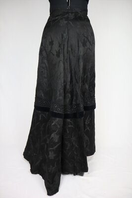 Schwarzer Rock aus Seidenjacquard mit floralem Muster. Er schließt vorne seitlich mit Druckknöpfen, darüber sind zur Deko mit nachtblauem Samt bezogene Knöpfe angenäht. Im unteren Teil ist eine Stufe angetäuscht durch maschinelle Tüllspitze mit Samtbandabschluss. Der Rock ist hinten unregelmäßig lang, diese Asymmetrie scheint von vornerein so gewesen zu sein.