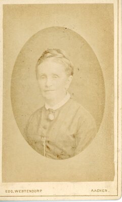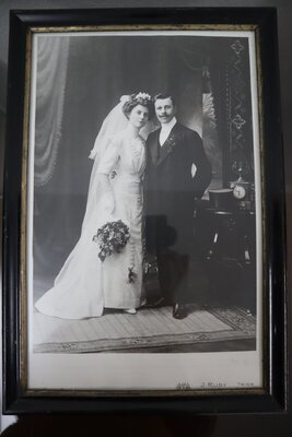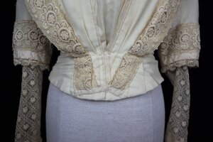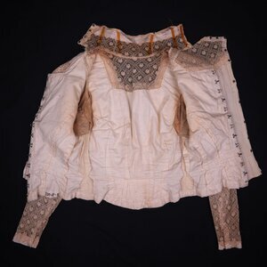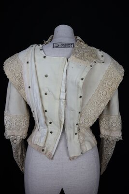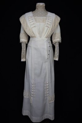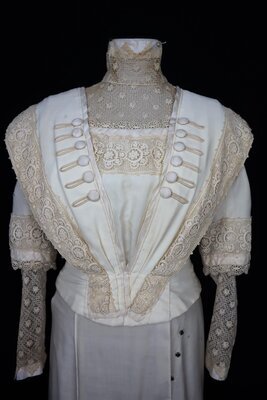 Zu dem Hochzeitskleid existiert ein Foto das die Trägerin und ihren Ehemann zeigt (siehe letztes Foto). Es ist aus dünner cremefarbener Wolle gefertigt, das Oberteil ist außerdem mit Baumwolle gefüttert. Es ist in V-förmig zulaufende Falten gelegt, die durch dekorative Knöpfe mit aus Soutache angedeuteten Knopflöchern, einem Band aus floraler Netzspitze und Akzenten aus creme Seidentaft verziert sind. Maschinell bestrickte Tüllspitze ziert die Ärmel, den Halsausschnitt und Kragen. Das Oberteil schließt in der rückwärtigen Mitte im Futter mit einem kommerziell hergestellten Haken- und Ösen-Band, der untere Teil ist durch Metallstäbe verstärkt. Sonst sind keine Nähte mit Metallstäben ausgestattet. Der Rock spiegelt das Design des Oberteils wieder und wiederholt die Knopfe und Spitze in der unteren Hälfte. In dem Hochzeitsfoto ist zu sehen dass ursprünglich ein Gürtel zu dem Ensemble gehörte, dieser ist leider verloren gegangen.