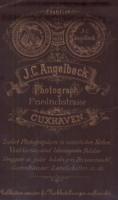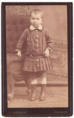 Zu sehen ist ein Mädchen von ca. drei Jahren im Fotoatelier. Die rechte Hand ist leicht geschlossen und auf die Sitzfläche eines Stuhles gelehnt. Das Kind trägt einen Kittel, welches unten in einem Faltenrock endet. Vom Kragen bis zum Ende des Rockes ist eine Reihe von großen Knöpfen sichtbar. Um die Taille ist ein Gürtel gelegt, in den sich das Kind mit einem Daumen eingehakt hat. Der Mund des Kindes ist leicht geöffnet und der Blick geht etwas am Fotografen vorbei.