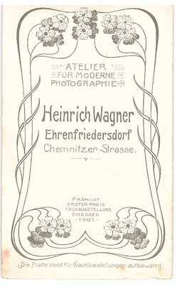 Zu sehen ist ein Baby in einem Taufkleid. Es sitzt auf einem weißen Fell. Um den Rücken abzustützen, hat man ein weiteres Fell etwas zusammengelegt. Die rechte Hand des Kindes ruht auf dem Oberschenkel. Die linke Hand ist ein wenig erhoben und es scheint, als wolle es auf etwas zeigen. Unter dem Foto sind der Name und der Sitz des Fotoateliers vermerkt.