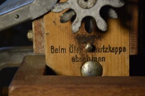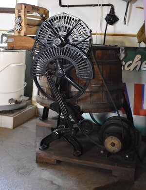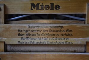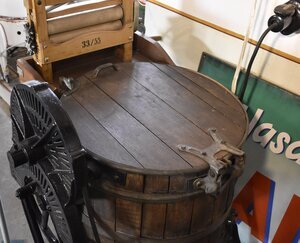 Miele Kraft-Waschmaschine Nr. 50 (früher Model S) mit Holzbottich. Sie war die erste Waschmaschine mit einem elektrisch betriebenen Antrieb durch einen angebauten Elektromotor. Die Waschmaschine konnte auch als Modellvariation 51 mit Handbetrieb oder als Modellvariation 52 mit einem Antrieb über einen Transmissionsriemen bestellt werden. Die Waschmaschine konnte in sechs Größen von 80 bis 200 Liter und für drei verschiedene Stromarten (Dreh-, Wechsel-, und Gleichstrom) bestellt werden. Die ausgestellte Waschmaschine ist das Modell mit 100 Litern. Das Besondere an dieser Waschmaschine war für den Kunden, dass (fast) keine menschliche Kraftanstrengung beim Wäschewaschen mehr erforderlich war. Die Waschmaschine hatte zwar keine Heizung und man musste eine bereits heiße Waschlauge einfüllen, dafür wurde das Rührwerk über einen Elektromotor, ein Transmissionsseil, große gefräste Zahnräder und ein Wringergetriebe angetrieben, sodass kein anstrengendes Bearbeiten der Wäsche von Hand mehr erforderlich war. Allerdings benötigte das Auslohen des Bottichs als Vorbereitung am Tag vor dem Waschtag einen erheblichen Arbeitsaufwand. Das Rührwerk wurde über ein Transmissionsseil, Zahnräder und ein Gestänge von unten angetrieben und besteht aus einem Waschkreuz aus Metall, einer Holzsäule unter diesem und hölzernen Faßstäben, mit denen die Wäsche bewegt werden kann. Somit sind alle Teile die mit der Wäsche in Berührung kamen wäscheschonend aus Holz gefertigt. An unserer Waschmaschine ist oben ein wahrscheinlich später angebrachter Wringer befestigt mit dem großer Teil des Wasser aus dem jeweiligen Wäschstück herausgepresst werden konnte. Der Wringer wurde mit einer Handkurbel bedient. Die Maschine konnte auch ohne Wringer oder mit einem über die Zahnräder angetriebenen Wringer erworben werden. Bei unserer Maschine handelt es sich um ein Modell mit einem am Gestänge angebrachten Elektromotor (Serien-Nr 57064). Der Antrieb über ein Transmissionsseil wurde dabei als Defekte vermeidend beworben. Zahnräder und Getriebe wurden dabei durch Schutzbleche vor unabsichtlicher Berührung und herunterlaufendem Wasser geschützt. Wir bedanken uns beim MIELE-Museum für die ausführlichen Informationen zu dieser Waschmaschine.
