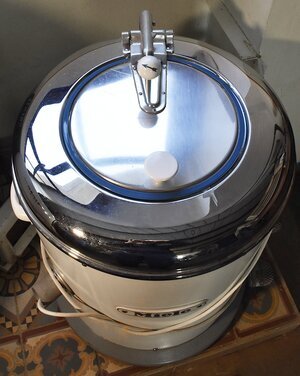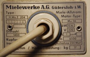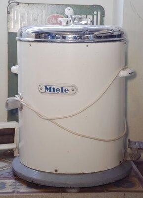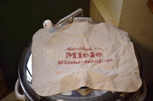 Wäschezentrifuge oder Wäscheschleuder des Herstellers und der Marke Miele,Typ HWZ 204 mit senkrecht stehender Trommel und ein Pedal für eine mechanische Bremse. Das Fassungsvermögen beträgt 19 Liter für ca 5 kg trockene Wäsche. Hergestellt wurde sie 1959-1964. Die Schleuder ist außen weiß emailliert und besitzt einen messing-verchromten Kupferkessel (alternantiv war auch ein verzinkter Kupferkessel erhältlich). Geschleudert werden konnte mit bis zu 1400 Umdrehungen. Der Motor war für Gleich- und Wechselstrom ausgelegt. Auf dem Gerät in halber Höhe vorne ein Schild mit der Firmenbezeichnung Miele, unten auf der Rückseite um den Elektroanschluss herum ein Schild mit den technischen Daten (s. Foto) und links darunter einen Auslauf für das ausgeschleuderte Wasser. Der Deckel der Schleuder ist mit einem Bügel auch aus Sicherheitsgründen sicher verschließbar. Vorne unten befindet sich eine mit dem Fuß bedienbare mechanische Bremse, mit der der Schleudervorgang abgekürzt werden konnte.Erhalten ist auch das originale Abdecktuch zu dieser Miele-Wäschezentrifuge. Wäscheschleudern gibt es seit ca. 1900. Zuerst nur mit Handbetrieb kamen die ersten elektrischen Wäscheschleudern um 1930 zuerst noch ohne Deckel, mit geringem Fassungsvermögen und preislich nur für sehr überdurchschnittlich wohlhabende Kundschaft auf den Markt. Nach dem Zweiten Weltkrieg waren Wäscheschleudern auch für deutlich größere Kreise der Bevölkerung finanziell erreichbar und wurden anstatt von Wringmaschinen oder dem Auswringen per Hand zum ersten Wasserentzug nach der Handwäsche oder der Wäsche in einer Bottichwaschmaschine genutzt. In den 1960er-Jahren hatten sich Trommelwaschmaschinen endgültig durchgesetzt. Allerdings war es noch nicht möglich die Wäsche in der Trommel der Waschmaschine mit der erforderlichen Geschwindigkeit zu schleudern. So gab es Kombigeräte aus Waschmaschine und Schleuder oder eben wir in unserem Fall zweit separate Geräte. Die Schleuder ist somit der Nachfolger der Wringmaschine. Beide haben die Aufgabe möglichst viel Wasser aus der eben gewaschenen Wäsche herauszubekommen um den anschließenden Trockenvorgang zu verkürzen. Seit der Entwicklung von Waschvollautomaten wurden separate Schleudern zu einem Nischenprodukt. Wir bedanken uns beim MIELE-Museum für die ausführlichen Informationen zu dieser Wäscheschleuder.