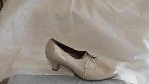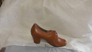 Ein Einzelner Brauner Damen-Schnürschuh aus Leder. Runde Form, Schuhgröße 5,5. Der Schuh hat einen metallgenagelten, mit Leder bezogenen Absatz (5,5 cm). Er verfügt über eine Schnürung, mit Ösen an der Innenseite, Durchbrüche an den Seiten und Lederschnüre am Schuhblatt vorne. An den Schnürsenkel befindet sich ein Holzpöbbel.
