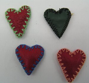 Vier amulettartige Herzen aus Leder/Kunstleder mit eingenähten kleinen Wachspäckchen