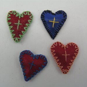 In drei roten Herzen und einem blauen sind kleine Wachsplättchen eingenäht. Zwei aus Lederstücken (rotes Herz mit grünem Rand) oder Kunstlederstücken geschnittene Herzen sind mit einem Baumwollfaden zusammengenäht, dazwischen befindet sich ein Stückchen Wachs, wie es bei der Inventarnummer IZ 1516 beschrieben ist. Auf der Vorderseite ist ein Kreuz gestickt. Die 4 Herzen haben unterschiedliche Größen und Farben: Blau mit schwarzem Rand und gelbem Kreuz, Rot mit rosa Rand und rosa Kreuz, Rot mit blauem Rand und blauem Kreuz, Rot mit grünem Rand und grünem Kreuz. Herstellung: Devotionalienwerkstatt im ehemaligen Kloster St. Clara, Petrisberg, Trier, 1920-2018