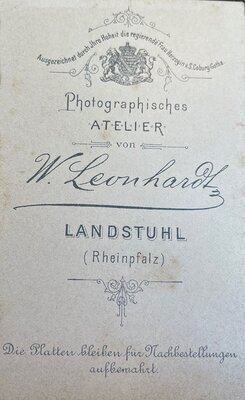 Zu sehen ist ein Mädchen, das sich im Atelier auf einen Schemel stützt. Es trägt ein Kleid mit sehr großen Karos. Um die Taille ist ein Gürtel gelegt. Um den Hals ist ein, mit spitzen besetzter Kragen zu sehen. Dieser Kragen lässt den Hals kürzer erscheinen. Das das Mädchen die recht Schulter etwas anhebt, sieht es aus, als wäre das Kind etwas ängstlich. Das Mädchen steht etwas schräg, mit der rechten Seite zum Fotografen hin und blickt an diesem vorbei. Unter dem Foto ist der Name und der Sitz des Fotoateliers vermerkt.