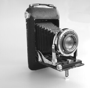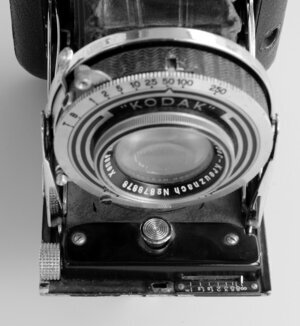 Die Balgenkamera „Kodak Regent“ wurde in den Jahren 1935 bis 1937 von der Kodak AG (ehemals Firma Nagel), unter der Seriennummer 779 441 hergestellt. Zwei unterschiedliche Negativ Formate stehen zur Verfügung. Mit 6 x 9 cm konnten 8 Bilder, mit 6 x 4,5 konnten 16 Bilder aufgenommen werden. Dazu war der Rollfilm 620 von Kodak zu verwenden. Das 10,5-cm-Objektiv (KB-Äquivalent: 38,88 mm bzw 60,6 mm ) , Xenar f/3,8 ist von Schneider, Kreuznach und hat einen Compur Verschluss. Die Entfernung wird, mit Hilfe eines Rändelknopfs, auf der vorderen Grundplatte eingestellt. Die Verschlusszeiten waren wählbar zwischen 1 bis 1/250 sec sowie B & T. Die Kamera kam im Rahmen einer Schenkung in unser Museum.