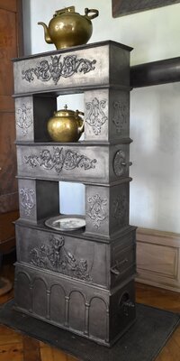 Zirkulierofen aus geschwärztem Eisenguss. Er hat 3 Stockwerke und steht auf einem Sockel. Die Felder des Ofens sind mit getrennt gegossenen Zierelementen versehen. Auf dem untersten Stockwerk fährt Neptung einen Dreizack haltend auf einer Muschel die von 4 Pferden im Stil einer Quadriga durch das Wasser gezogen wird. Der Schwanz des linkestens Pferdes läuft dabei in einen Dreizack aus. Die oberen Stockwerke sind mit Rankenwerk und je einem Teufelskopf verziert. Auf den Elementen links und rechts der Öffnungen befindet sich vorne und auf der Aussenseite je eine Lyra. Rechts unten am Ofenbefindet sich die Brennkammer. Zwischen dieser und der Ascheschublade befindet sich ein Rost, sodass mit diesem Ofen Holz, Torf und vor allem Kohle verfeuert werden konnte. Befeuert wurde der Ofen in unserer Gegend wohl hauptsächlich mit Holz. Unter Brennkammertür befindet sich der Aschenkasten. Was den Etagen- oder Zirkulierofen ausmacht, beginnt sozusagen ein Stockwerk höher. Über drei Etagen wurden die Rauchgase durch horizontale und vertikale Kanäle, wechselnd rechts und links geführt, die eine optimale Energieausbeute gewährleisten sollten. Durch einen Drehregler in der Brennkammertür bestand zudem die Möglichkeit, die Luftzufuhr und damit den Abbrand in einem gewissen Rahmen zu regulieren.