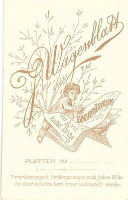 Zu sehen ist ein kleiner Junge, der sich auf die Armlehne eines Stuhles stützt. Er trägt eine Jacke, die am Kragen mit einer großen Schleife verziert ist. Am mittleren Knopf der Jacke ist eine kleine Kette besestigt, die in der linken Jackentasche endet. Hieran ist wahrscheinlich eine kleine Taschenuhr beftigt. Das Kind trägt eine dunkle Hose und hohe Schuhe. Unter dem Foto sind der Name und der Sitz des Fotoateliers vermerkt.