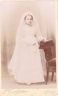 Zu sehen ist ein junges Mädchen, welches ein Kommunionskleid trägt. Mit dem Schleier und dem Kranz in den Haaren erinnert es stark an ein Brautkleid. An beiden Händen werden Handschuhe getragen. Die Linke ruht auf der hohen Armlehne eines Stuhls. In der rechten Hand trägt sie ein Gebetbuch. Unter dem Foto sind der Name und der Sitz des Fotoateliers vermerkt.
