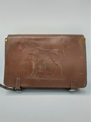Die Schultasche, oder auch der Schulranzen ist aus dunkelbraunem Leder gefertigt und sie besitzt auf Vorderseite ein eingeprägtes Pferdemotiv Der Deckel der Tasche wird mit zwei Schnallen am unteren Rand der Vorderseite geschlossen und die Träger sind auf der Rückseite mittig befestigt. Am Boden der Tasche sind sie auf der einen Seite mit einer Schnalle befestigt und auf der anderen Seite kann der Träger einfach ein- und wieder ausgehängt werden. So ließ sich die Tasche leichter an- und wieder ausziehen. Der Innenraum der Tasche besteht aus einem einzigen großen Fach. Die Seiten und der Boden der Tasche sind mit Karton verstärkt, damit die Tasche nicht so leicht ihre Form verliert. Es finden sich keinerlei Prägungen oder Aufkleber, die einen Hinweis auf den Hersteller geben. Auf der Innenseite des Deckels ist jedoch das Wort "Losheim" eingerahmt von einem Kreis, welcher wiederum in ein Viereck eingefasst ist, gestempelt. Das kann eventuell Aufschluss darauf geben, dass die Tasche ursprünglich aus Losheim stammt. Material/Technik