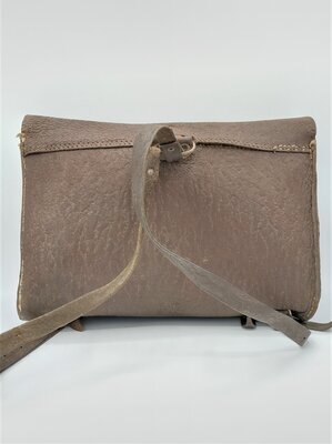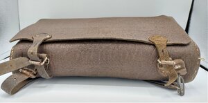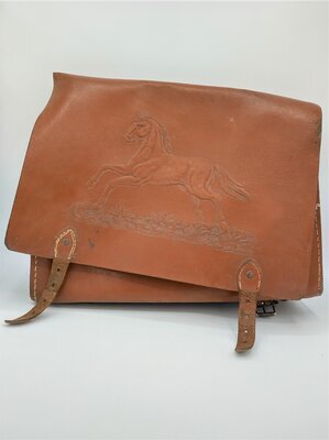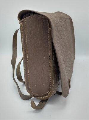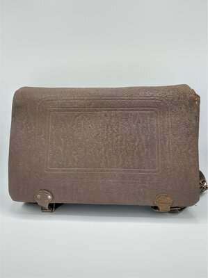 Die Schultasche, oder auch der Schulranzen ist aus dunkelbraunem Leder gefertigt und sie besitzt auf der Vorderseite ein viereckiges Muster bei dem ein Rechteck von einem weiteren Rechteck eingeschlossen ist. Der Deckel der Tasche wird mit zwei Schnallen am unteren Rand der Vorderseite geschlossen und die Träger sind auf der Rückseite mittig befestigt. Am Boden der Tasche sind sie auf der einen Seite mit einer Schnalle befestigt und auf der anderen Seite kann der Träger einfach ein- und wieder ausgehängt werden. So ließ sich die Tasche leichter an- und wieder ausziehen. Der Innenraum der Tasche besteht aus einem einzigen großen Fach. Die Seitenteile und der Boden der Tasche sind mit Karton verstärkt, damit die Tasche ihre Form besser hält. Es finden sich keinerlei Prägungen oder Aufkleber, die einen Hinweis auf den Hersteller geben.