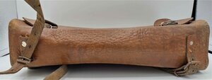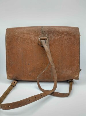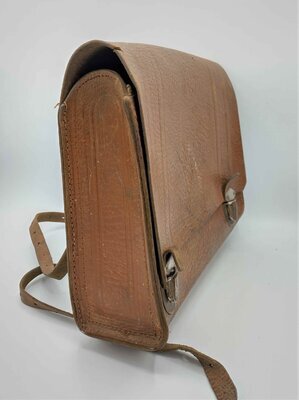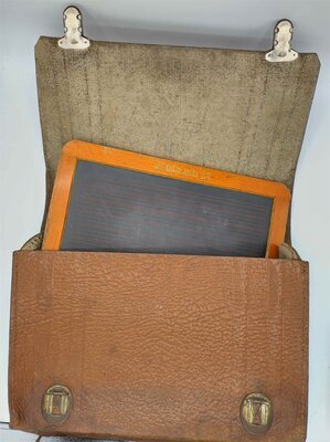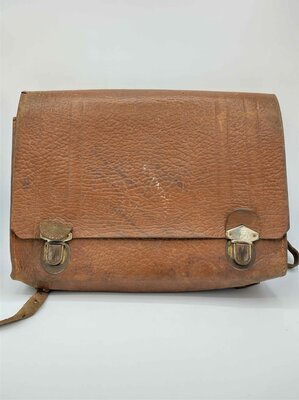 Die Schultasche, oder auch der Schulranzen ist aus dunkelbraunem Leder gefertigt. Sie zwei Schnappschnallen, an welchen der Deckel geschlossen werden kann. Die Träger der Tasche sind auf der Rückseite mittig befestigt, und können auf der Unterseite je an einer Schnalle festgemacht werden. Auf dem Deckel der Tasche sind einige dunklere Streifen sowie weitere Abnutzungsspuren zu erkennen. Der Innenraum der Tasche besteht aus einem einzigen großen Fach, in dem noch eine Schiefertafel der Marke Rhein-Tafel vorhanden ist. Die Seitenteile sind mit Karton verstärkt, so dass die Tasche ihre Form nicht verliert. Die Tasche besitzt keinerlei Prägung oder Ähnliches, was Aufschluss über den Hersteller geben könnte.