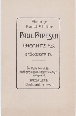 Zu sehen sind ein etwa fünfjähriger Junge und ein Kleinkind im Fotoatelier. Das kleine Kind trägt ein langes Kleidchen mit Puffärmeln und einer großen Halskrause. An den Füßen sind Schuhe zu sehen. Es sitzt in einem Sessel mit halbrunder Lehne. Der größere Junge hat den Arm auf die Kante der Lehne gelegt. Er trägt einen Anzug mit Jacke, Weste, steifem Kragen und Krawatte wie ein Erwachsener. Um den Hals ist ein Halstuch sichtbar. In der linken Hand hält der Junge eine Mütze an deren Schirm fest. Beide Kinder blicken direkt in die Kamera. Unter dem Foto sind der Name und der Sitz des Fotoateliers vermerkt.