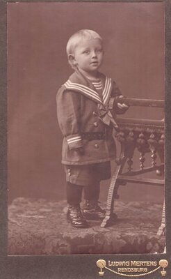 Zu sehen ist ein kleiner Junge im Fotoatelier. Er umgreift die Lehne eines Schemels mit der linken Hand. Schemel und Junge stehen auf einem kleinen Podest, dass mit einem Teppich belegt ist. Der Matrosenanzug ist dem Jungen etwas zu groß, er wurde von den Eltern wahrscheinlich auf "Wachstum" gekauft. Die wilhelminische Flottenpolitik führte zu einer symbolischen Wandlung des Matrosenanzugs. mit dem Kleidungsstück wurde die Begeisterung für die Flotte ausgedrückt. Der echte Kieler Matrosenanzug" wurde zum Symbol des bürgerlichen Nationalstolzes. Unter dem Foto sind der Name ind der Sitz des Fotoateliers vermerkt.