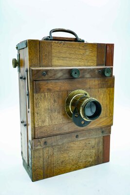 Eine Reisekamera besonderer Art, von einem unbekannten Hersteller. Ob das kleine, aufgeschraubte Schild mit der Aufschrift „ W. Heino Berner, Photographische Manufaktur, Erfurt", auf den Hersteller schließen lässt, konnten wir nicht klären. Die Plattenkamera wurde ca. 1900 hergestellt. Das Gehäuse ist aus Holz gefertigt und zusammenklappbar, so dass die Kamera gut mit auf Reisen genommen werden konnte. Ein Tragegriff an der Oberseite erleichter den Transport der 1,8 Kg schweren Kamera. Eckenschutz, Scharniere, Drehknöpfe und der Tragebügel sind aus Messing gefertigt. Ebenso das Objektiv, das den Namen „Rapid Aplanat No.2“ trägt. Die Objektivplatte ist seitlich verschiebbar. Die Blende ist zwischen den Werten 9 und 384 einstellbar. Nach dem Öffnen zweier Haltebügel lässt dich die Grundplatte abklappen und der Balg an vorgesehenen Haltepunkten arretieren. Durch zwei seitliche Drehräder lässt sich der doppelte Bodenauszug in die erforderliche Position bringen. Leider ist die Mattscheibe im Format 9 x 13 cm nicht mehr vorhanden.