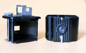 Diese sehr einfache Kamera wurde von Kodak zwischen 1936 - 1939 in den USA hergestellt. Der Sucher ist aufklappbar und besteht aus 2 Metallscheiben mit unterschiedlich großen Ausstanzungen. Das Gehäuse besteht aus braunem Bakelit. Unterhalb des Objektives ist ein kleines Hebelchen, was sich als Auslöser entpuppt. Möglich waren 8 Bilder im Format 4 x 6 cm. Die Blende kann nicht eingestellt werden und ist fix auf f/16 eingestellt. Die Verschlusszeiten sind zwischen 1/50, B,T wählbar. Auf der Unterseite der Kamera ist ein kleiner Schiebeverschluss, mit dem sich der Foto zum Filmwechsel in zwei Teile zerlegen lässt.