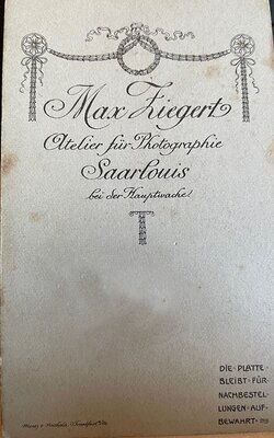 Zu sehen ist ein größeres Mädchen im Kommunionskleid. Der rechte Arm ist auf einen Betstuhl gelehnt. Hinter dem Kind wurde eine Leinwand heruntergelassen, auf die Säulen aufgemalt sind. Das Kleid ist weiß und mit Spitze verziert. Das Kleid ist hochgeschlossen, über die Schultern ist ein weiterer Kragen gelegt. Um den Hals trägt sie eine Kette mit einem Kreuz. Die Hände sind durch Handschuhe verborgen. Vor dem Bauch sind die Hände übereinandergelegt und tragen ein Gebetsbuch sowie einen Rosenkranz. Auf dem Kopf ist ein aufwändiger Haarschmuck zu sehen. Unter dem Foto sind der Sitz und der Name des Fotoateliers vermerkt.