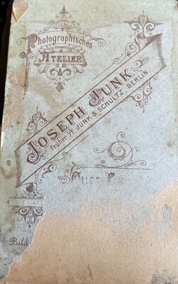 Zu sehen ist ein Junge im Fotoatelier. Er steht zwischen einem Stuhl und einem kleinen Tisch. Auf den Tisch sind eine dunkle Decke mit großen Fransen und ein stehendes Kreuz zu sehen. Der Junge trägt einen dunklen Anzug, der auf der linken Seite mit einem kleinen Blumengesteck geschmückt ist. Über den rechten Unterarm wurde ein Rosenkranz gelegt, in der rechten Hand ist ein Gebetsbuch zu sehen. Die linke Hand hält an der Krempe einen Hut fest. Unter dem Foto sind der Sitz und der Name des Fotoateliers vermerkt.