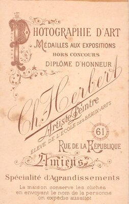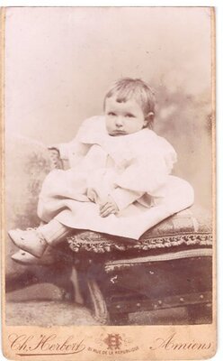 Zu sehen ist ein kleines Kind, welches man auf einen Hocker mit Kissen gesetzt hat. Es trägt einen weiten, weißen Mantel mit großem Kragen. Unter dem Mantel ist eine gestrickte Hose sichtbar. Das Kind trägt weiße Schuhe und sitzt mit der linken Seite zum Fotografen. Es hat den Kopf nach links gedreht und schaut den Fotografen direkt an. Unter dem Foto sind der Sitz und der Name des Fotoateliers vermerkt.
