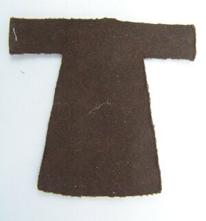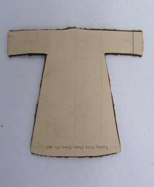 Aus einem Stück braunem Jersey ist der heilige Rock mit ausgebreiteten Ärmeln ausgeschnitten. Er ist auf eine Postkarte des Verlags Niko Haas, Trier, Nr. 462 aufgeklebt - die Postkarte wurde in den Konturen des heiligen Rocks ebenfalls ausgeschnitten, sodass nur der Schriftzug und Ausschnitte der Linien für die Adresse zu sehen sind. Herkunft: Devotionalienwerkstatt des Klosters St. Clara, Petrisberg, Trier, 1920 - 2018