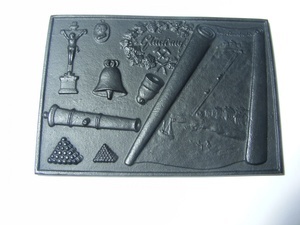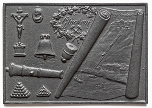 Eisenguss; geschwärzt; Relief; Querformat; Nachguss der Kunstgießerei Buderus Hirzenhain um 1973; Die anlässlich des Neujahrs 1819 erstmals herausgegebene Sayner Neujahrsplakette zeigt auf einem aufgerollten Plan die sog. Schienenfahrt, - einen von der Sayner Hütte produzierten Schienenweg vom Rheinufer zur Festung Ehrenbreitstein, außerdem Geschütze und Kanonenkugeln, eine Glocke sowie aus der Produktion der Kunst- bzw. Tiegelgießerei ein Altarkruzifix und ein Bildnismedaillon. Auf der Vorderseite oben sind das Bergbausymbol (Eisen und Schlägel gekreuzt) und der Bergmannsgruß "Glück auf!" in einem Ahornkranz zu erkennen. Auf der Rückseite ist die Gießereimarke der Kunstgießerei Buderus in Hirzenhain zu sehen. Entwurf: Carl Osterwald (1793-1868). Modelleur: Heinrich Zumpft.