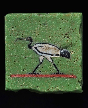 In extremer Vergrößerung zeigt die Abbildung ein Detail aus dem kleinen Mosaikglas mit der Darstellung eines Vogels. Durch die Körperform, die langen Beine und den charakteristischen dünnen Schnabel gibt der Vogel sich als Ibis zu erkennen. Das Muster eines solchen Mosaikglases erhielt man, indem man lange, dünne Glasstäbe oder Plättchen und vorgeformte Elemente - wie den s-förmig geschwungenen Hals, den Leib und den Schwanz des Vogels - dicht nebeneinanderstellte und durch Erhitzen miteinander verschmolz. Aus den Glasstäben konnten nach Erkalten mehrere Glasscheiben mit gleichem Dekor geschnitten werden. Gläser dieser Art wurden vom 1. Jahrhundert v. bis zum 1. Jahrhundert n. Chr. hergestellt. Für die Ibisdarstellung legt die Wahl des Motivs die Herkunft aus Ägypten nahe: Der Ibis ist das heilige Tier des Thot, des ägyptischen Gottes der Weisheit, der Schreibkunst und des Mondes. Bis nach Tawern, südwestlich von Trier, hat das Glas eine Reise von vielen Hundert Kilometern zurückgelegt. Der Zweck, welchem es gedient hatte, ist nicht eindeutig. Vielleicht zierte es, mit weiteren Stücken seiner Art, ein Holzkästchen.