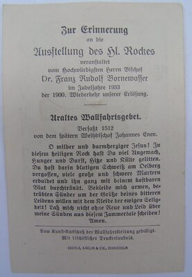 Zweiseitig bedrucktes Andenkenbild an die Ausstellung des heiligen Rocks in Trier. Auf der Vorderseite ist der an einer Stange hängende heilige Rock in dunkelbrauner Farbe abgebildet; zwei Engel in schwarz-weiß rechts und links halten die Stange. Zwischen den Engeln und oberhalb des heiligen Rocks sind die Dornenkrone und die drei Kreuznägel in hellbrauner Farbe abgebildet. Unterhalb des heiligen Rocks ist ein Spruchband mit der Inschrift: "1933 / ANDENKEN AN TRIER". In beiden Ecken unten befinden sich die Buchstaben "L" und "H", das Monogramm des Entwerfers. Auf der Rückseite befindet sich ein "Uraltes Wallfahrtsgebet / Verfaßt 1512 / von dem späteren Weihbischof Johannes Enen." Darüber ist die Widmung dieser Ausstellung "vom Hochwürdigsten Herrn Bischof / Dr. Franz Rudolg Bornewasser im Jubeljahre 1933 / der 1900. Wiederkehr unserer Erlösung." abgedruckt. Unter dem Wallfahrtsgebet steht der Hinweis: "Vom Kunst-Ausschuss der Wallfahrtsleitung gebilligt. / Mit bischöflicher Druckerlaubnis." Druck: Eberle, Kaelin & Cie., Einsiedeln. Herkunft: Devotionalienwerkstatt des Klosters St. Clara, Petrisberg, Trier, 1920 - 2018