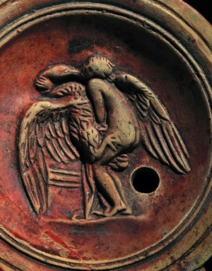 Im Spiegel dieser frühen römischen Bildlampe ist die Vereinigung von Leda mit dem Göttervater Zeus dargestellt, der sich ihr in Gestalt eines Schwanes genähert hat. Lampen, die im Spiegel ein Bildmotiv zeigen, sind im 1. Jh. n. Chr. in den westlichen Provinzen bevorzugte Beleuchtungsgeräte. Die Motive umfassen alle Bereiche des täglichen Lebens: politische Propaganda, die Welt der Götter und griechische Sagen, Motive aus dem kultischen Bereich, Tiere oder Pflanzen. Besonders beliebt sind Bilder aus dem Circus und Amphitheater sowie erotische Szenen. Die Herstellung von Bildlampen in einer zweiteiligen Form ermöglichte eine serienmäßige Vervielfältigung. Je nach Größe der Exemplare und Dicke des Dochtes spendeten sie über mehrere Stunden Licht. Die Lampe gehörte zur Ausstattung eines Grabes bei St. Matthias in Trier.